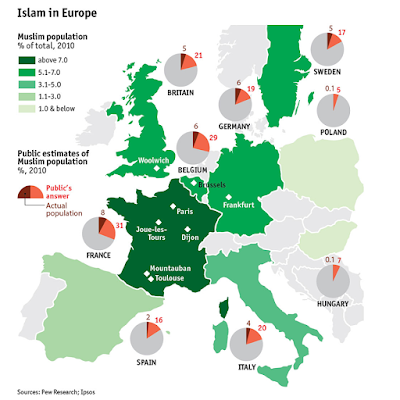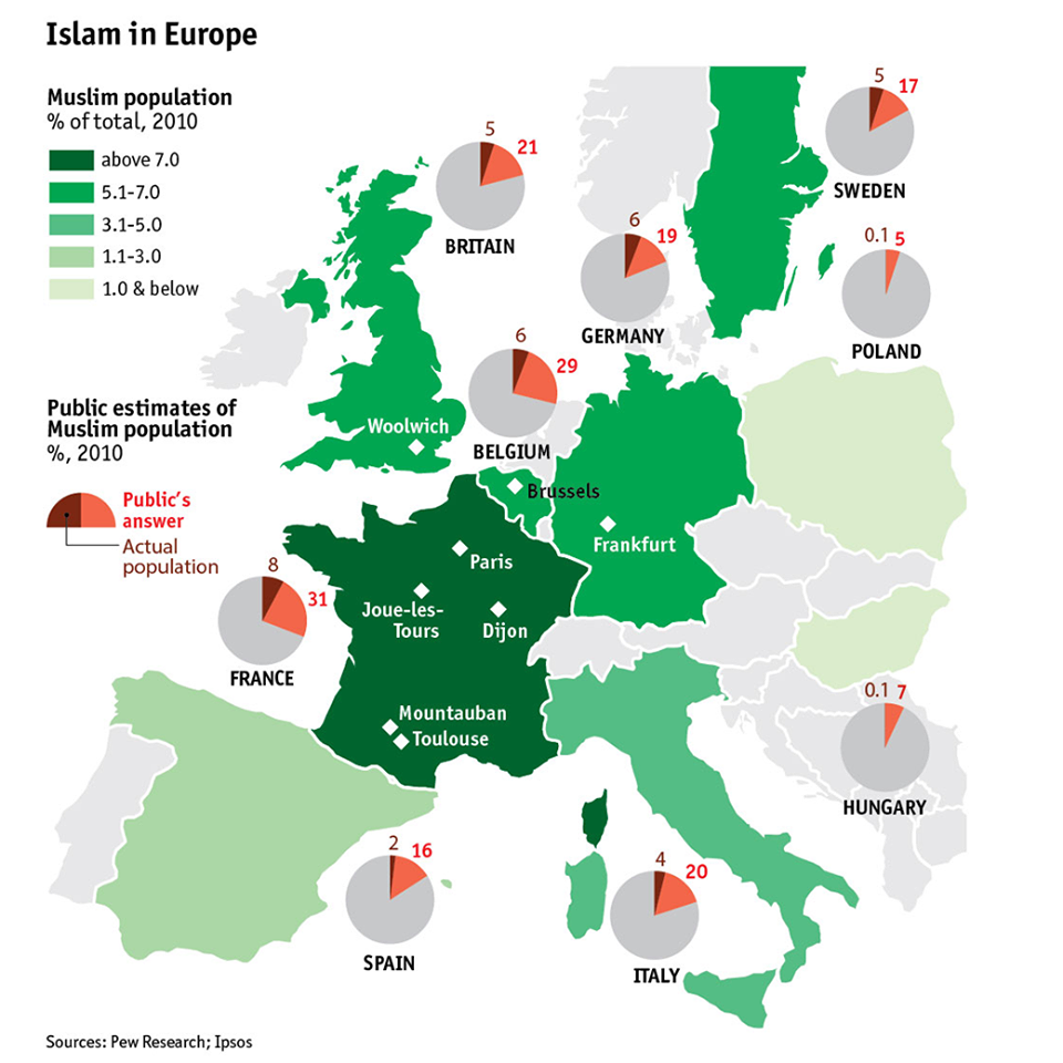L’Islam in EU. Si noti come la percezione comune è di una presenza almeno 4-5 volte superiore al reale. |